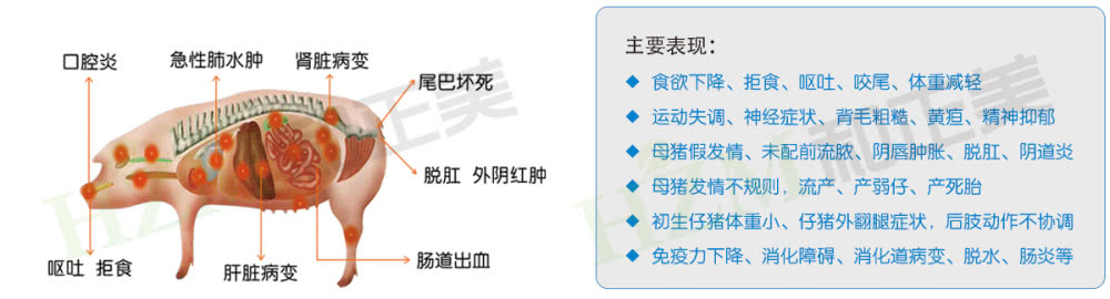 主要癥狀:影響胚胎發(fā)育、免疫力紊亂、拒絕采食、嘔吐、耳尖和尾壞死,神經(jīng)癥狀步態(tài)不穩(wěn)、豬拒食導致:大豬不肯睡、日增重下降、料肉比增加、生長緩慢。