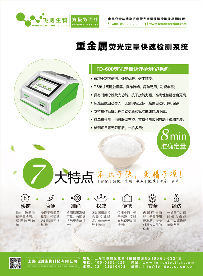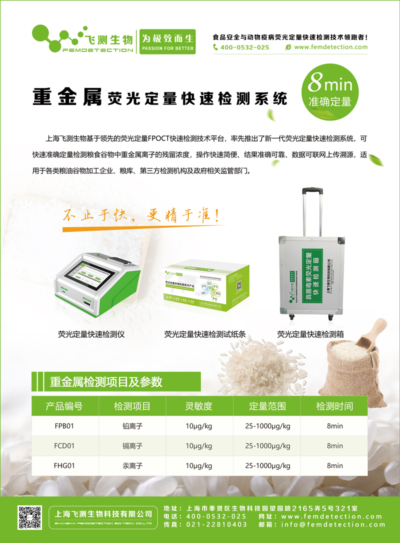 以上幾種方法所需儀器較復(fù)雜貴重,前處理準(zhǔn)備時(shí)間及檢測(cè)時(shí)間較長(zhǎng)。南京微測(cè)生物基于領(lǐng)先的熒光定量FPOCT技術(shù)平臺(tái),開發(fā)了真菌毒素+重金屬+農(nóng)藥殘留三合一熒光定量快速檢測(cè)系統(tǒng),該系統(tǒng)結(jié)合了膠體金快速、酶聯(lián)免疫定量以及色譜法準(zhǔn)確的特點(diǎn),可在8min內(nèi)快速準(zhǔn)確定量的測(cè)定出食品中重金屬的含量。前處理時(shí)間40分鐘左右,檢測(cè)范圍25ppb-1000ppb,可以滿足限量標(biāo)準(zhǔn)檢測(cè);操作簡(jiǎn)便,只需一步加樣,無需標(biāo)準(zhǔn)品,無需做標(biāo)準(zhǔn)曲線,采用熒光免疫定量分析儀讀數(shù),結(jié)果準(zhǔn)確可靠且可現(xiàn)場(chǎng)打印,準(zhǔn)確性高度符合HPLC法的檢測(cè)結(jié)果,為重金屬的快速檢測(cè)提供了一種全新的技術(shù)手段,適用于各類飼料加工企業(yè)、第三方檢測(cè)機(jī)構(gòu)及政府相關(guān)監(jiān)管部門。
