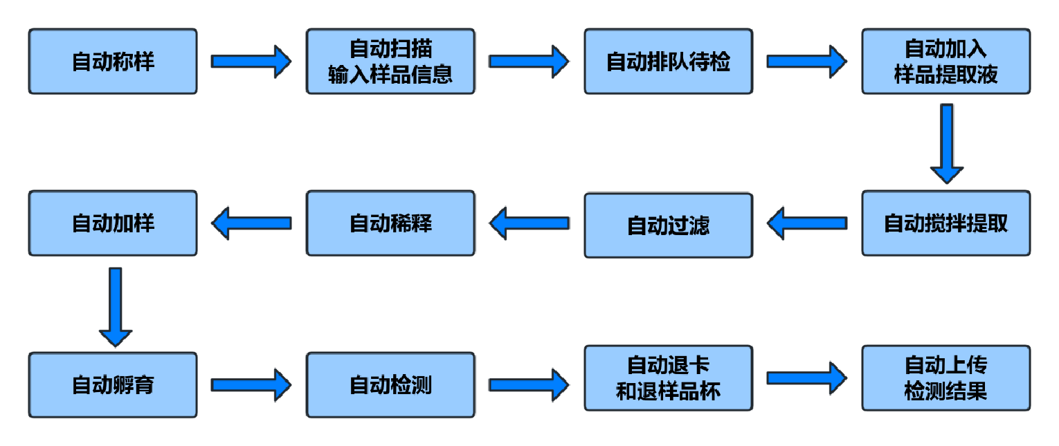 實現樣本從稱量、加液、振蕩提取、分離、稀釋混勻、孵育到檢測的全流程自動化與無人化;