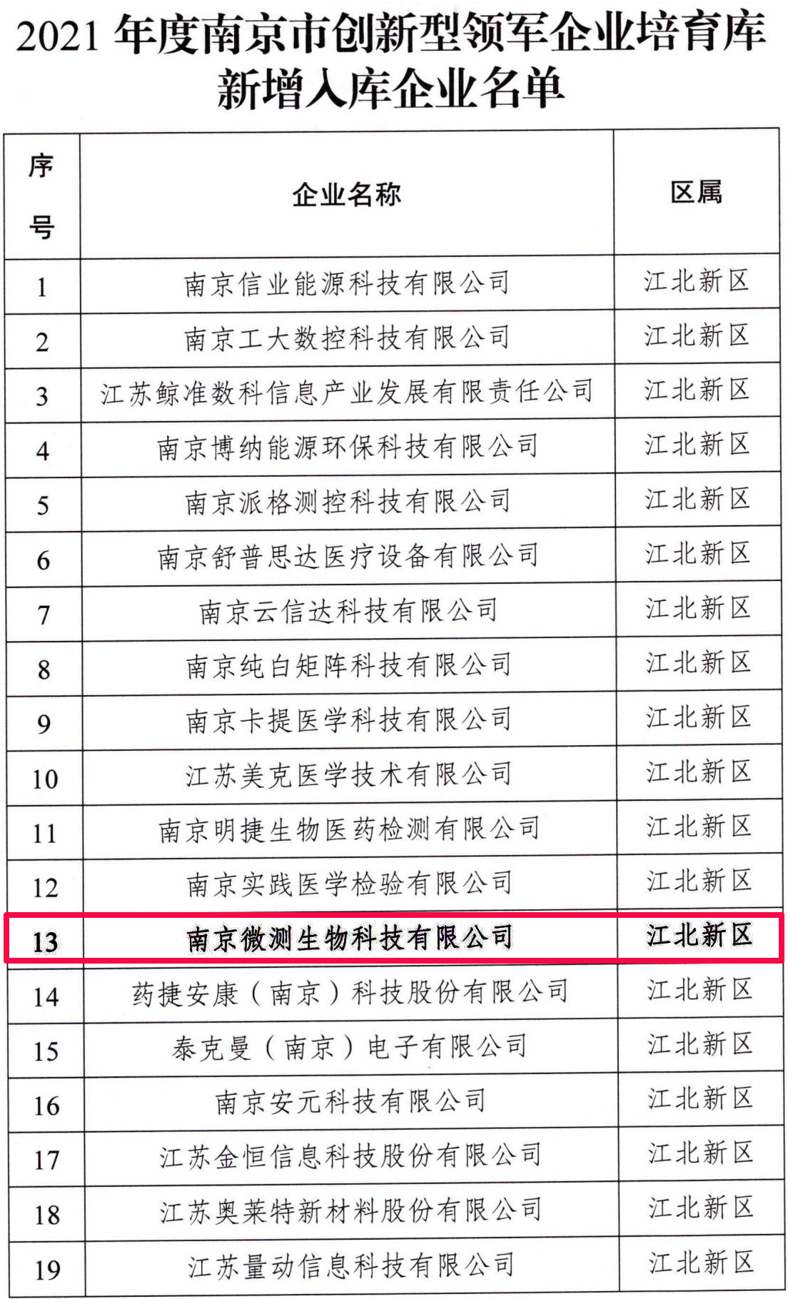 南京微測生物科技有限公司成功入選2021年度南京市創(chuàng)新型領軍企業(yè)培育庫入庫企業(yè)榜單。