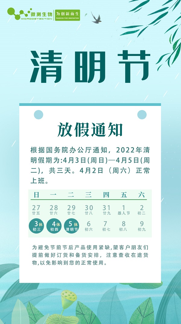 響應(yīng)國家政策清明節(jié)放假3天,清明好時(shí)節(jié),行走山水間,大家有出行計(jì)劃的也要記得做好疫情防護(hù)哦,南京微測放假期間安排如下: