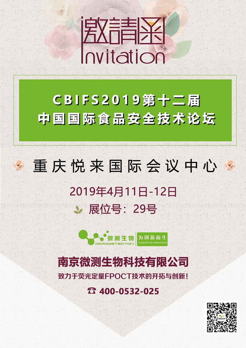 CBIFS2019第十二屆中國(guó)國(guó)際食品安全技術(shù)論壇”將于2019年4月11日-12日在重慶悅來(lái)國(guó)際會(huì)議中心舉辦。南京微測(cè)生物將攜真菌毒素+重金屬+農(nóng)藥殘留三合一熒光定量快速檢測(cè)系列產(chǎn)品參加本屆盛會(huì),誠(chéng)邀各位新老客戶蒞臨交流,我們將為您提供有關(guān)食品安全與動(dòng)物疫病熒光定量快速檢測(cè)方面詳盡的技術(shù)咨詢、檢測(cè)演示及現(xiàn)場(chǎng)答疑解惑。南京微測(cè)展位號(hào):29號(hào),恭候您蒞臨交流。
